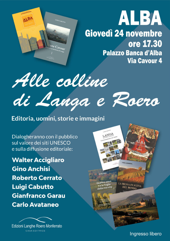 ALBA Giovedì 24 novembre alle 17.30 al palazzo Banca d’Alba di via Cavour 4, sarà presentato il libro Alle colline di Langa e Roero, editoria, uomini, storie e immagini edito da Edizioni Langhe, Roero e Monferrato casa editrice. Nell’occasione Walter Accigliaro, Gino Anchisi, Roberto Cerrato, Luigi Cabutto, Gianfranco Garau e Carlo Avatenao dialogheranno con il pubblico sul valore dei siti Unesco e sulla diffusione editoriale. L’ingresso alla presentazione è libero.