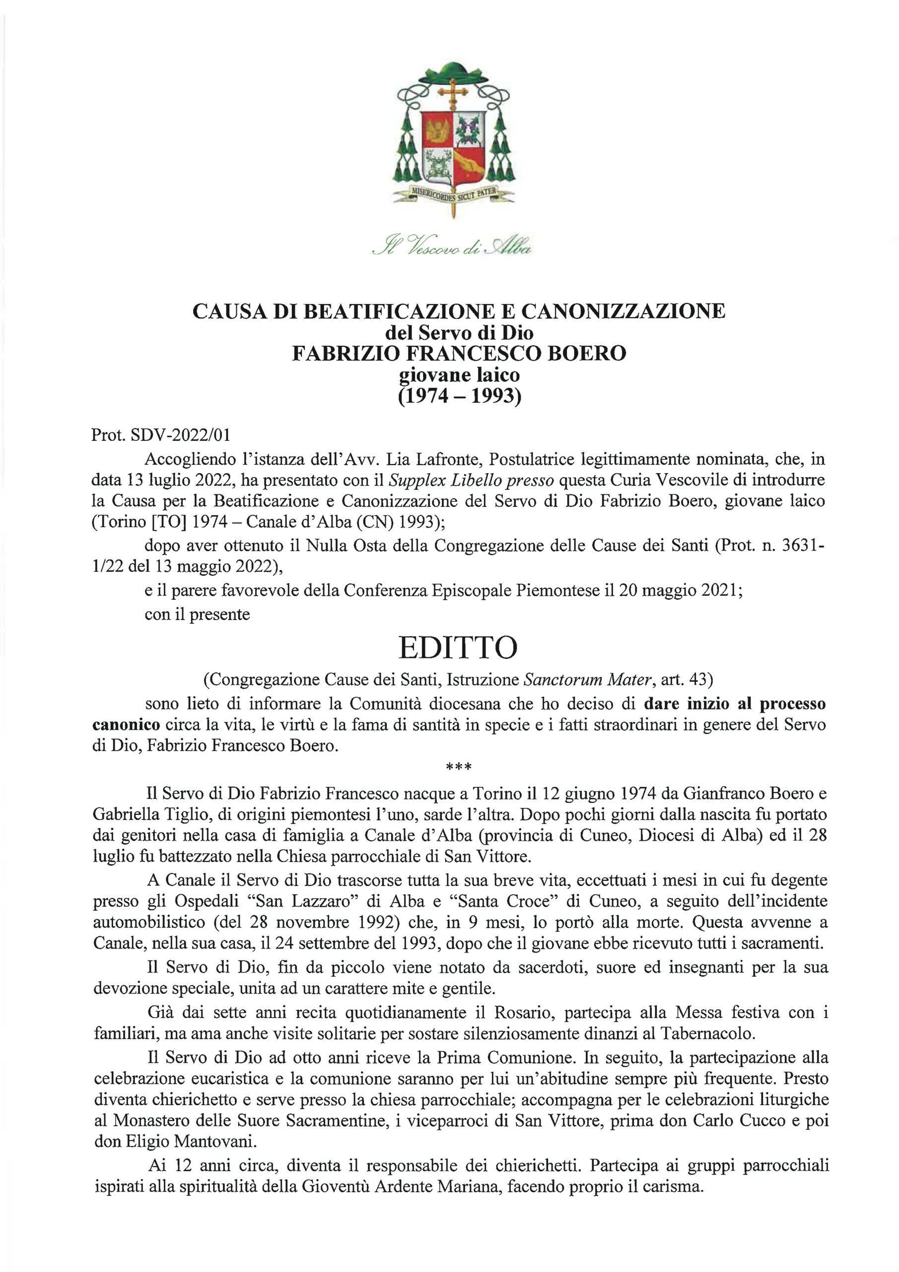 ALBA Sabato 12 novembre, il vescovo di Alba, Marco Brunetti, ha dato “avvio al processo canonico circa la vita, le virtù e la fama di santità” del servo di Dio Fabrizio Francesco Boero. Viene cioè formalmente aperto l’iter canonico che porterà alla beatificazione del giovane nato a Torino il 12 giugno 1974 e deceduto a Canale nel 1993.