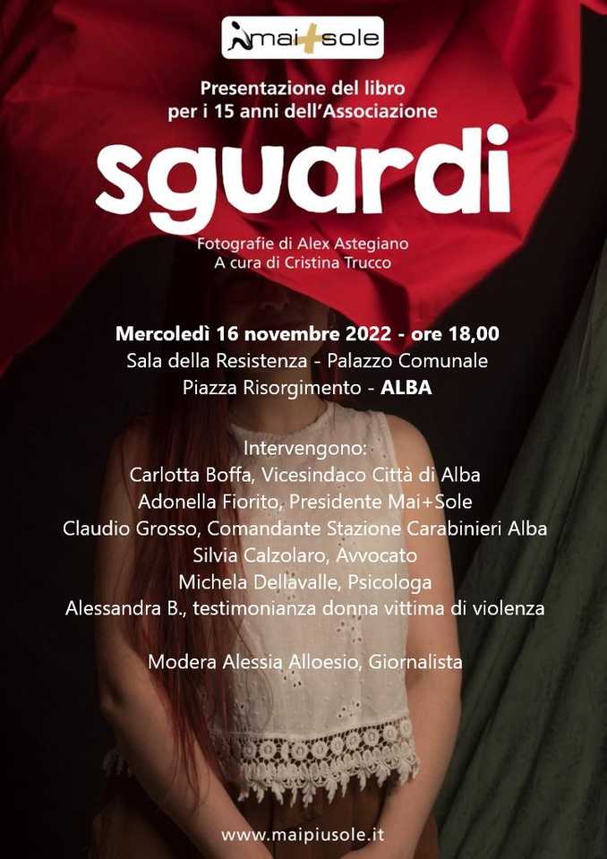 ALBA In occasione dei 15 anni dalla fondazione dell’associazione Mai + sole, è stato realizzato un libro dal titolo Sguardi, una raccolta fotografica di ritratti di donne che si sono rivolte all’associazione, ma anche di volontarie, professionisti, sostenitori che negli anni hanno collaborato e fatto sì che diventasse un punto di riferimento importante per tante donne in difficoltà.