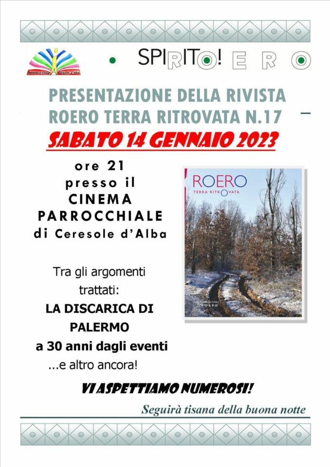 CERESOLE D’ALBA Il numero 17 della rivista Roero terra ritrovata, pubblicata dall’associazione culturale Spirito Roero, sarà presentato sabato 14 gennaio alle 21 presso il cinema parrocchiale di Ceresole d’Alba. Tra gli argomenti che verranno affrontati durante la serata ci sarà anche la discarica di Palermo a trent’anni dagli eventi: seguirà una tisana della buona notte per tutti i presenti all’incontro.