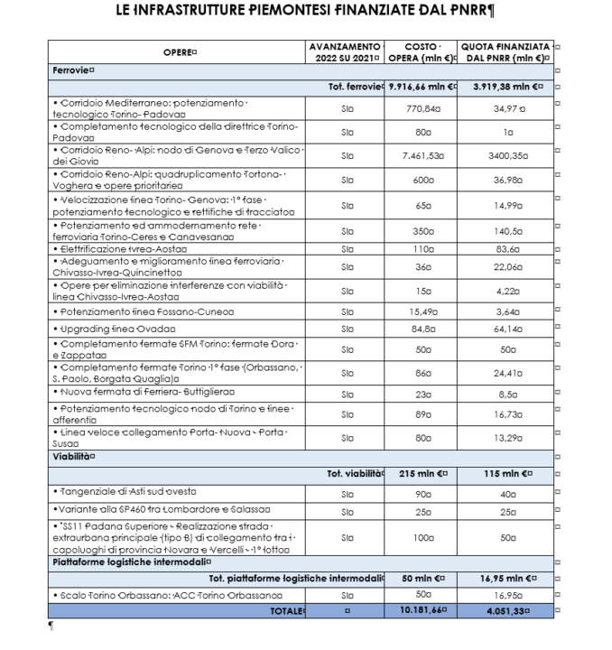 Quasi un terzo degli interventi che saranno ultimati entro dieci anni, riguardano il corridoio Mediterraneo che comprende: completamento della Torino-Lione ferroviaria; ripavimentazione della A4 Torino-Milano; il potenziamento del nodo ferroviario di Novara e della linea Acqui Terme-Ovada-Genova; il raddoppio del tunnel autostradale del Frejus. Tre interventi ricadono sul corridoio Reno-Alpi con la conclusione nel 2025 del Terzo Valico, le bretelle ferroviarie merci sul nodo di Novara e il quadruplicamento della Tortona-Voghera. Ben sei opere insisteranno sui valichi alpini, due riguarderanno il sistema aeroportuale, dieci insisteranno sui nodi urbani, e infine nel 2026 si stima il completamento del piano per la banda ultralarga, che riguarda il sistema delle connessioni immateriali.