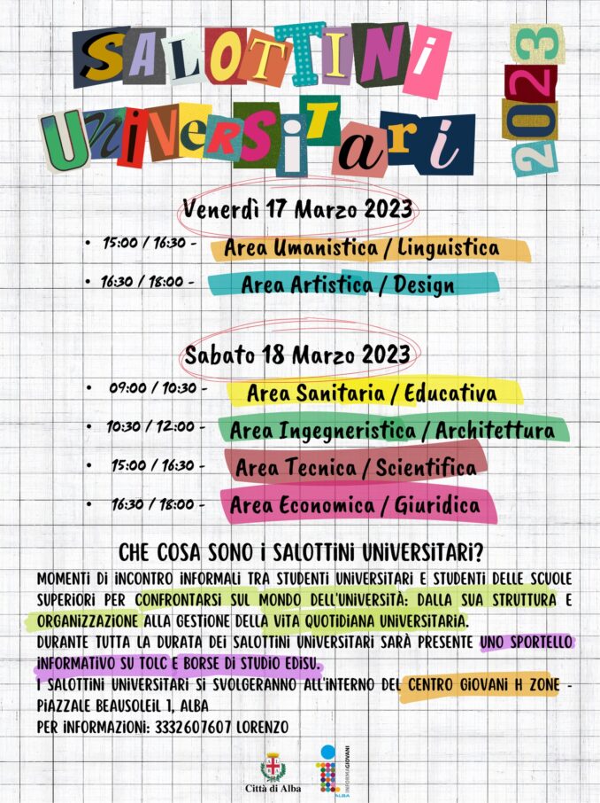 ZONA H L’Amministrazione comunale di Alba attraverso l’Assessorato alle politiche giovanili e all’Informagiovani guidati dall’assessora Carlotta Boffa organizza i Salottini universitari, all’interno del Centro giovani della Zona H venerdì 17 dalle 15 e sabato 18 marzo dalle 9. Momenti di incontro informali tra studenti universitari e delle scuole superiori per un panorama informativo sul mondo dell’università: dalla struttura, fino alla gestione della vita quotidiana.