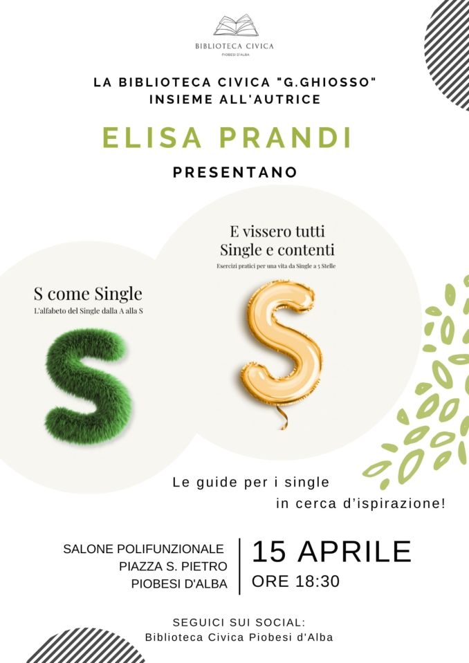 PIOBESI Sabato 15 aprile, alle 18.30, nella biblioteca Civica di Piobesi saranno presentati gli ultimi due libri di Elisa Prandi: E vissero tutti single e contenti e S come single firmati con lo pseudonimo La Prandissima.