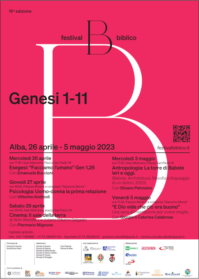Sarà il primo libro della Bibbia, la Genesi – e in particolare i capitoli dall’1 all’11 – il filone tematico attorno al quale si articolerà la proposta culturale della 19ª edizione del Festival Biblico, promosso da Diocesi di Vicenza e Società San Paolo per stimolare una riflessione sulla contemporaneità alla luce delle Sacre Scritture ebraico-cristiane. Al progetto aderiscono le Diocesi di Verona, Padova, Adria-Rovigo, Vittorio Veneto, Treviso, Chioggia e Alba (nella formula del Fuori festival).