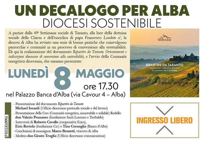 A questo scopo, è stato realizzato un documento intitolato Ripartire da Taranto. Orientamenti e indicazioni diocesane di conversione alla sostenibilità. Non solo, ma è stata avviata la Comunità energetica rinnovabile e solidale Rodello (Cers) a livello diocesano. La loro presentazione ufficiale sarà lunedì 8 maggio, alle 17.30, nel palazzo di Banca d’Alba (via Cavour 4, Alba).