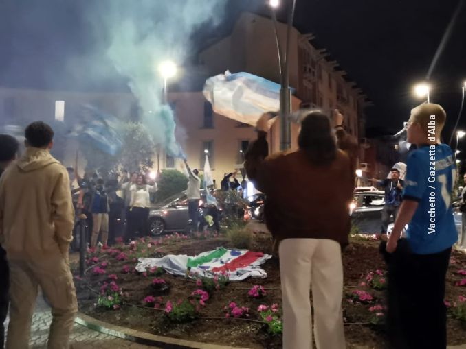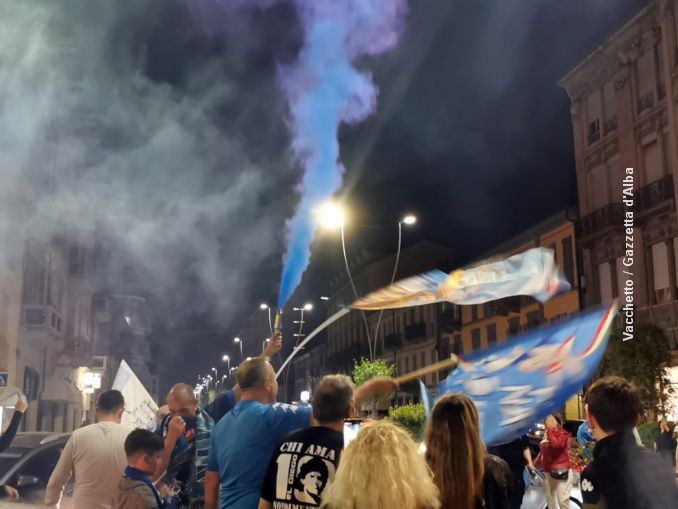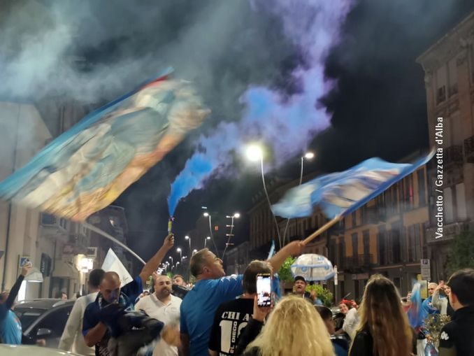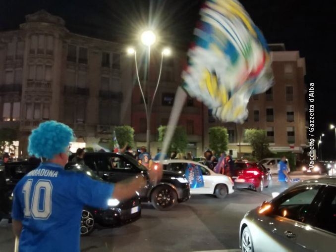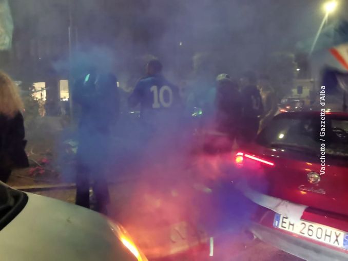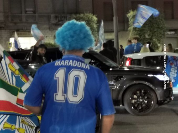 ALBA Fuochi d’artificio come a Capodanno, caroselli di auto, maglie con il nome e il volto di Maradona conservate a lungo nei cassetti: pochi minuti dopo la matematica conquista del terzo scudetto per il Napoli i tifosi si sono riversati in strada ad Alba, raggiungendo pizza Michele Ferrero per festeggiare.