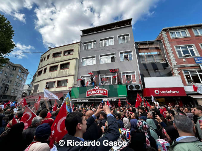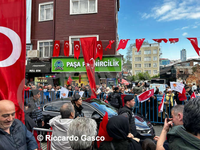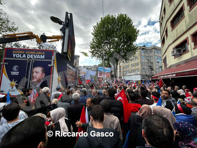 In apertura del comizio «ha ricordato gli interventi intrapresi per migliorare il quartiere, come la bonifica di alcune aree, l’apertura di moschee e scuole, la costruzione di nuovi palazzi. Un gruppo di persone, nell’accogliere il presidente sul palco, ha intonato il coro “siamo tutti soldati di Recep Tayyip Erdogan”. Si respira un clima di tensione e speranza, tutti attendono i risultati di questa sera, che potrebbero già essere noti intorno alle 23 ora turca. In Italia saranno le 22».