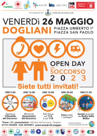 Alle ore 20 si terrà la “Cena sotto i castagni, per prenotazioni contattare l’Associazione Volontari del Soccorso Dogliani ai numeri di telefono 0173-742589 e 334-3922851 entro lunedì 22 maggio. La serata sarà animata da Radio Valle Belbo. L’Open day del soccorso 2023 ha ottenuto il patrocinio Comune di Dogliani.