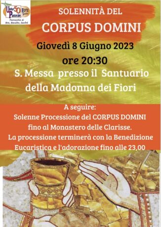 BRA Giovedì 8 giugno la Chiesa braidese è in festa e lo dimostrerà una piccola processione, che partendo dal Nuovo Santuario della Madonna dei Fiori, dopo la celebrazione della Messa che inizia alle 20.30, attraverso il Viale della Madonna dei Fiori, raggiungerà la chiesa del Monastero delle Clarisse, dove ci sarà la Benedizione Eucaristica e l’Adorazione Eucaristica fino alle 23.