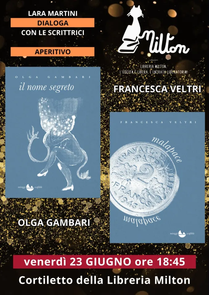 Venerdì 23 giugno alle 18.45 nel cortiletto interno della libreria Milton è prevista la presentazione di due romanzi meravigliosi di due altrettanto meravigliose scrittrici: Il nome segreto di Olga Gamberale e Malapace di Francesca Veltri, edite da Miraggi edizioni e presentate e lette da Lara Martini. A seguire piccolo aperitivo letterario.