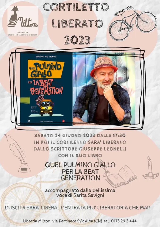 Sabato 24 giugno dalle 17 in libreria si terrà il secondo appuntamento con Il cortiletto liberato, che questa settimana ospiterà Quel pulmino giallo per la beat generation con il suo autore Giuseppe Leonelli e la voce e la canzoni di Sarita Savigni. Musica e parole per conlcudere in relax la settimana.