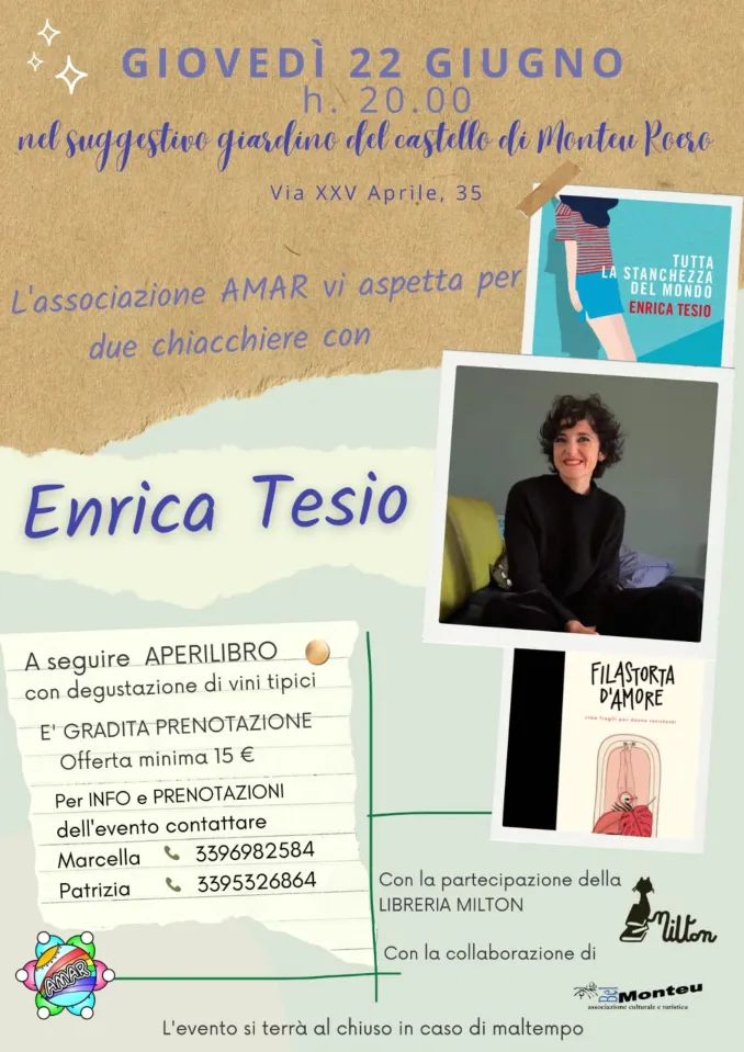 ALBA Non è solo il cortiletto in via Pertinace 9 ad Alba a ospitare gli incontri letterari promossi dalla libreria Milton: questa sera, giovedì 22 giugno dalle 20, la scrittrice Enrica Tesio sarà a Monteu Roero, nel giardino del castello, per parlare dei suoi libri Filastorta e Tutta la stanchezza del mondo. A seguire è previsto un aperilibro con l’autrice.