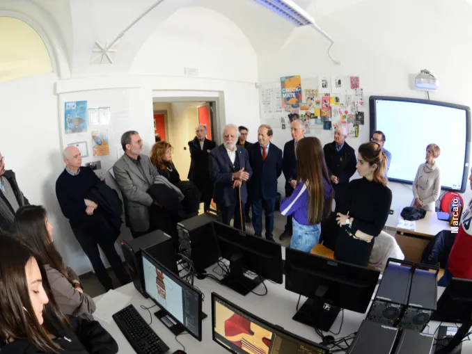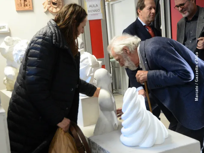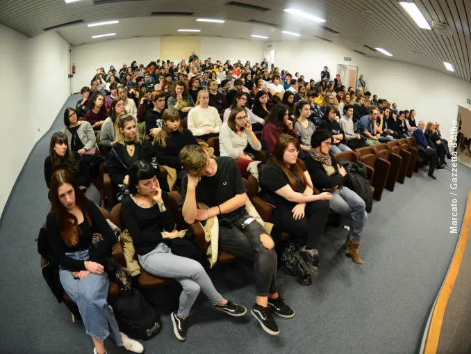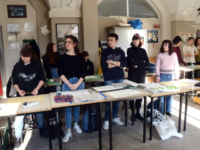 d’Alba, di fronte alla platea degli studenti del liceo artistico.