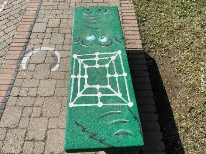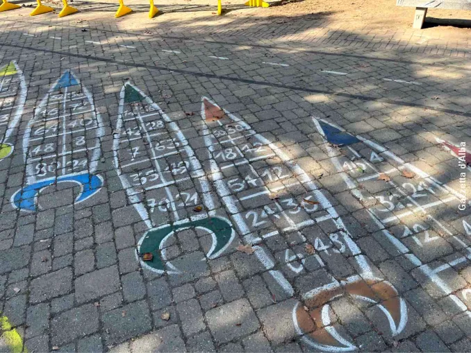Nel lungo percorso perimetrale si incontrano balene arricchite dei numeri da 1 a 100, alberi con le foglie di varie piante, reticoli con le note, le lettere dell’alfabeto, i razzi con le tabelline, un planisfero e, per concludere, la Zizzola.