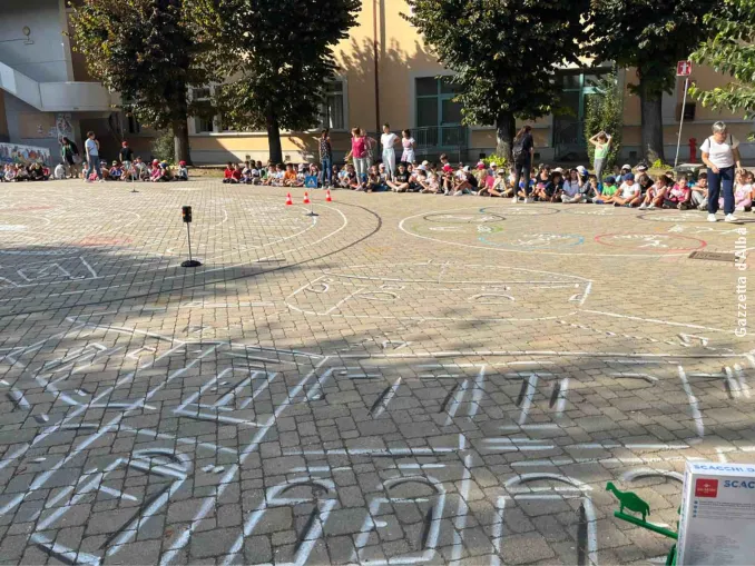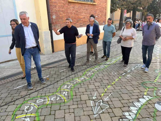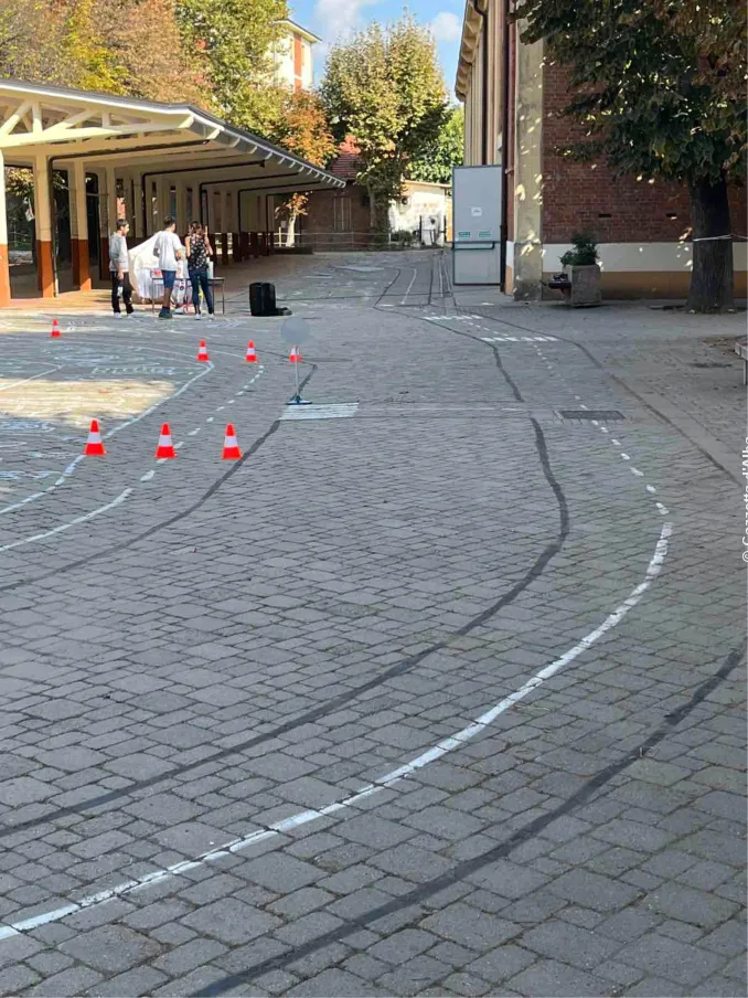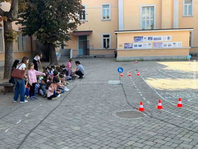 BRA Ci sono la Zizzola e la Tour Eiffel, ci sono le navicelle spaziali e gli abitanti del mare. E, tutto intorno all’immenso cortile della scuola primaria a tempo pieno Edoardo Mosca, c’è una pista ciclabile con tanto di strisce pedonali e di segnaletica.