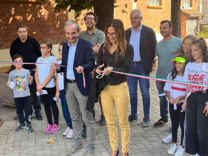 Oggi pomeriggio (giovedì 12 ottobre) alla presenza dei 350 piccoli allievi, del personale docente del plesso, della dirigente Claudia Camagna, del sindaco Gianni Fogliato e di alcuni genitori del Consiglio di istituto, è stato tagliato il nastro per inaugurare il cortile al centro voluto dai docenti e approvato dall’Amministrazione comunale.