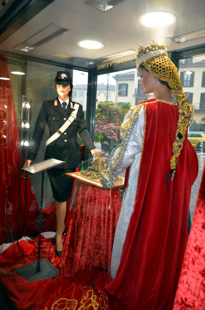 La scena è composta da due manichini femminili, uno rappresentante un Carabiniere donna in uniforme attuale e l’altro una dama del Palio, indossante un costume medioevale astigiano, la quale affida la città, rappresentata in un plastico con in evidenza le torri cittadine, alla militare.