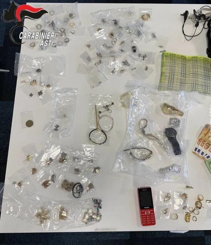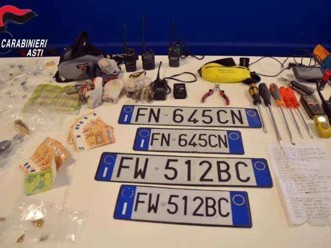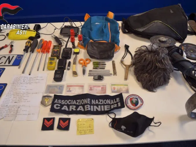 A bordo dell’auto, a cui era stata applicata una targa riconducibile a un veicolo dello stesso modello, sono stati rinvenuti numerosi oggetti preziosi e denaro contante, arnesi per lo scasso delle casseforti, falsi tesserini dei Carabinieri, della Guardia di finanza, della Polizia locale e anche di aziende operanti nel settore idrico, bombolette con spray urticante, ricetrasmittenti sintonizzate sui canali delle forze di polizia e delle società autostradali, nonché altre targhe contraffatte.
