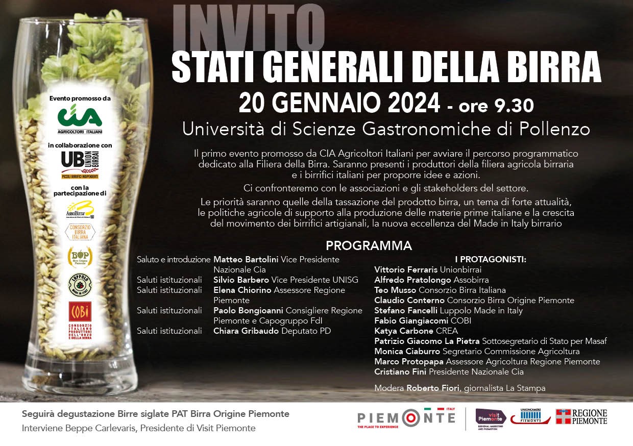 POLLENZO Arrivano gli Stati generali della birra. Sabato 20 gennaio si terrà il primo evento promosso da Cia-agricoltori italiani, in collaborazione con Unionbirrai, per avviare il percorso programmatico dedicato alla filiera della birra made in Italy insieme a tutti i protagonisti.