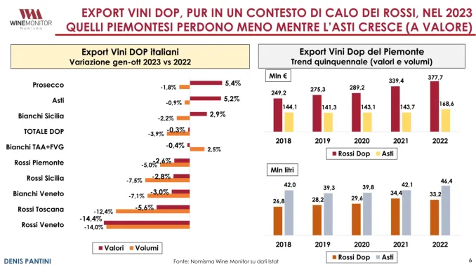 Denis Pantini, responsabile Nomisma wine monitor, ha analizzato le performance dei vini piemontesi, in particolare all’estero. Per quanto riguarda l’export di vini Dop italiani (-0,3% a valore, -3,9% a volumi), quelli piemontesi sono andati meglio della media, nel senso che l’Asti spumante Dop è cresciuto del 5,2% nei valori e leggermente calato nelle quantità esportate (-0,9%). I rossi fermi Dop piemontesi invece hanno subito una contrazione del 2,6% a valori e del 5% a volumi (contro, rispettivamente, un calo del 5,6% e del 8,1% che ha interessato l’intera categoria dei rossi Dop).