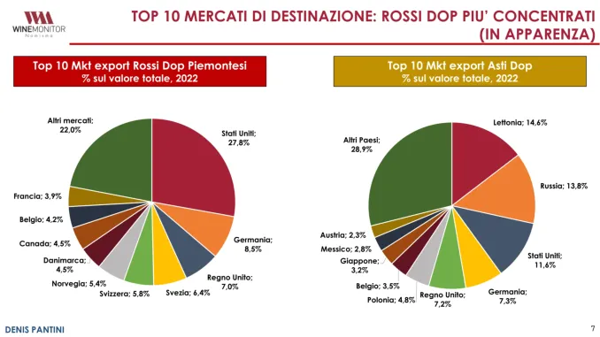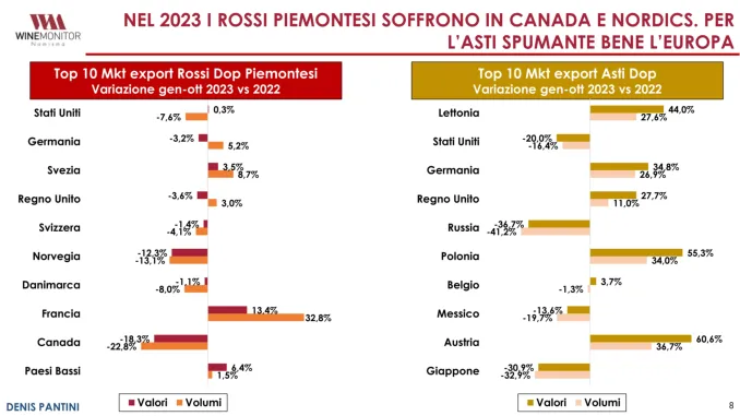 Guardando ai principali mercati di export dei vini Dop piemontesi, le variazioni rispetto al 2022 si sono manifestate in maniera differente. Così, nel caso dei rossi fermi e guardando ai valori, i principali cali hanno interessato il Canada, la Norvegia, la Germania e il Regno Unito mentre all’opposto si sono registrati aumenti in Francia e Svezia.