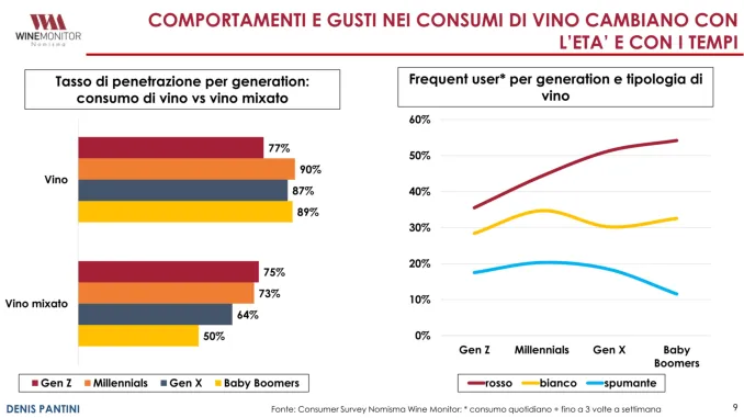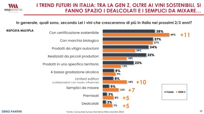 Quindi per mantenere inalterata la struttura produttiva della filiera vitivinicola italiana (con tutti i risvolti positivi che esprime a livello socio-economico per il Sistema Paese e per i singoli territori), occorrerà sia esportare di più (andando anche ad interessare mercati oggi poco presidiati dai produttori italiani) che comprendere per tempo l’evoluzione dei gusti e delle abitudini di consumo dei giovani d’oggi. Giovani che, attualmente nella scelta di acquisto di un vino, sembrano prediligere attributi in parte condivisi anche con le generazioni dei meno giovani (come l’origine territoriale, la valorizzazione dei vitigni autoctoni), altri indicati con maggiore enfasi (vini sostenibili) ma altri ancora dove il divario con la media dei consumatori italiani risulta molto evidente. È il caso dei vini “limited edition” (promossi da influencer o realizzati in collaborazione con imprese del mondo della moda e del fashion), ma soprattutto dei vini adatti alla mixology.