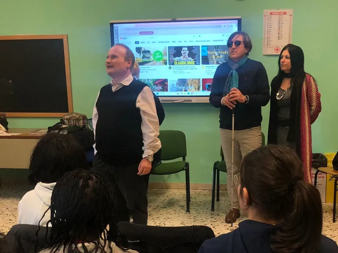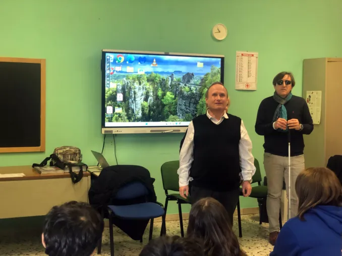 Il presidente di Apri (Associazione pro retinopatici e ipovedenti) Marco Bongi e il consigliere braidese della stessa associazione Valter Boffa hanno raccontato ai giovani, molto interessati, la quotidianità di un non vedente.
