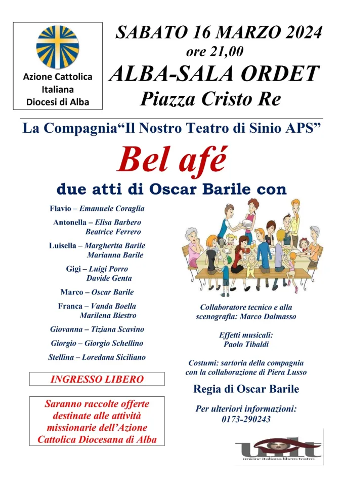 ALBA Bel Afè, la nuova commedia allestita dal Nostro teatro di Sinio con il testo di Oscar Barile, sarà messa in scena sabato 16 marzo, alle 21 ad Alba, in sala Ordet.