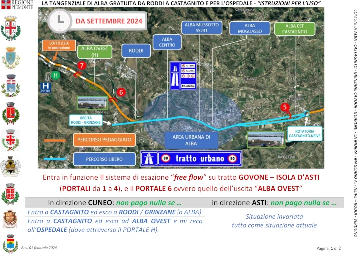 ALBA “La tangenziale gratuita di Alba: istruzioni per l’uso” è il titolo del documento redatto dal Comune di Alba, insieme agli altri Comuni interessati e di concerto con la Regione e con la società concessionaria, per spiegare nei dettagli come sarà la tangenziale dopo le varie tappe che porteranno all’attivazione totale dell’autostrada Asti-Cuneo, in particolare per quanto riguarda il pedaggio, con l’introduzione del sistema free flow.