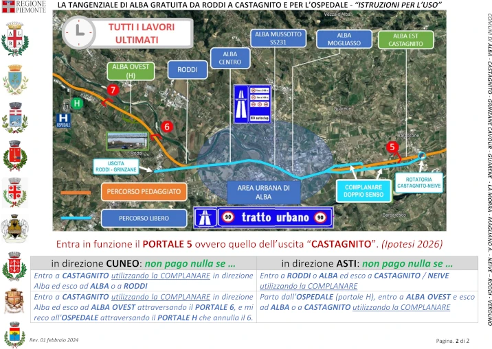In questo modo, percorrendo quest’ultima, sarà garantita la gratuità per i mezzi che entreranno a Castagnito e usciranno ad Alba o Roddi. Chi da Roddi o da Alba viaggerà in direzione di Castagnito, uscendo prima del portale 5 e percorrendo la strada parallela, potrà comunque evitare il pedaggio.