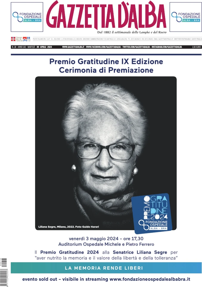 In questo numero la contro-copertina è dedicata al premio Gratitudine che verrà assegnato dalla fondazione Ospedale Alba-Bra a Liliana Segre. Cerimonia a Verduno venerdì 3 maggio.