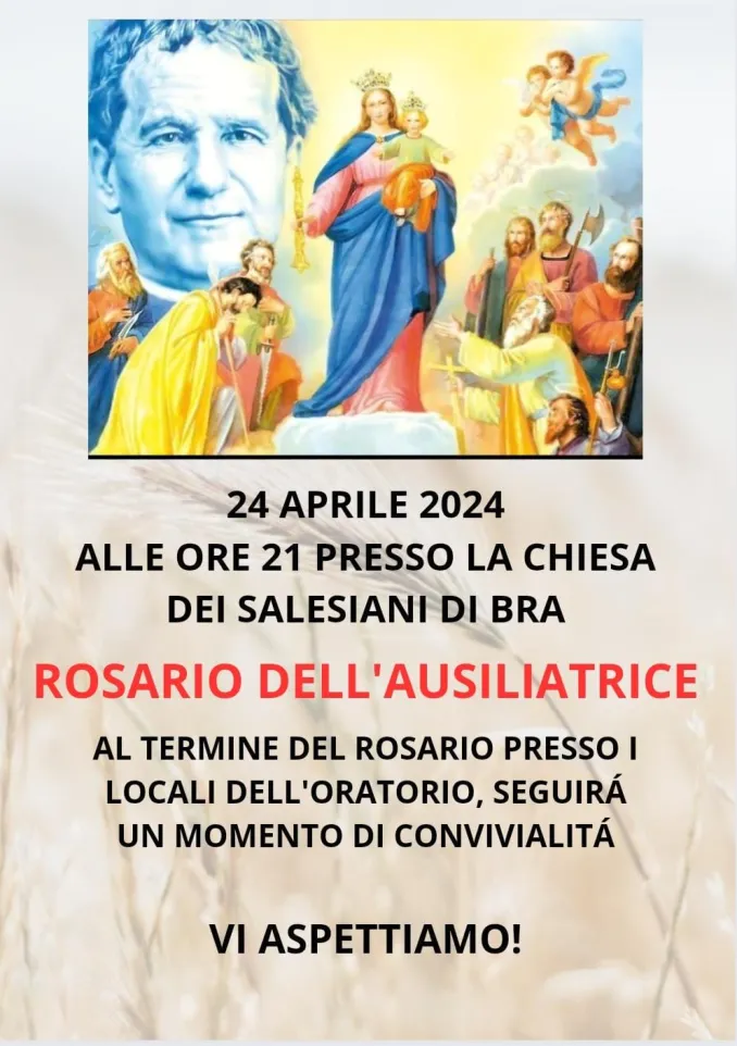 Dal settembre del 2022 è stato istituito il Rosario la sera del 24 del mese. Per questo, in attesa del mese di maggio, quando il Rosario tornerà tutte le sere, nei cortili dell’Istituto salesiano, giovedì 24 aprile, oltre alla Messa, ci sarà l’incontro di preghiera animato dai cooperatori e dai sacerdoti della comunità di Bra, che si terrà presso l’istituto San Domenico Savio. Dopo il Rosario la serata continuerà nei locali dell’oratorio con un momento di convivialità.