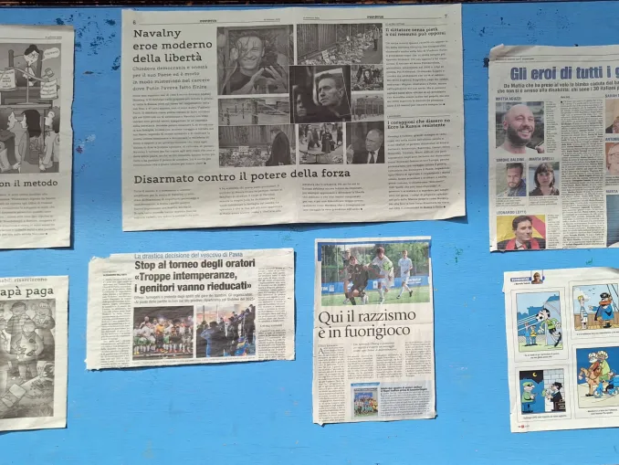 È stata rinnovata una bacheca per i giornali. Gli insegnanti e il preside Teresio Fraire si sono domandati come stimolare gli allievi a interessarsi dell’attualità e hanno pensato alla bacheca presso l’ingresso della scuola media in cui esporre articoli selezionati di avvenimenti importanti che é bene che anche i ragazzi conoscano. Una presenza fissa sono gli articoli da vari giornali e in particolare dall’inserto Popotus del quotidiano Avvenire e le immancabili e apprezzate barzellette tratte dalla rivista Famiglia Cristiana.