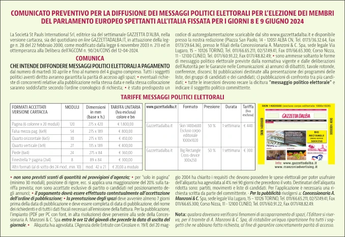 - A partire dal giorno successivo alla data di pubblicazione del Comunicato preventivo sulla testata, qualora tale pubblicazione sia avvenuta entro il 20/04/2024, fino a tutto il penultimo giorno prima delle elezioni l’Editore raccoglierà inserzioni di messaggi politici elettorali da pubblicare sulle testate stampa ed i relativi siti internet de