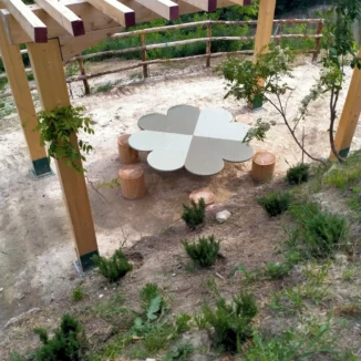 In particolare nel punto denominato Frutteto Magico è stato realizzato il pergolato Gelsomino con il tavolo quadrifoglio, un omaggio ai prati, che potrà essere utilizzato dai bambini per redigere disegni e ascoltare lezioni e favole.