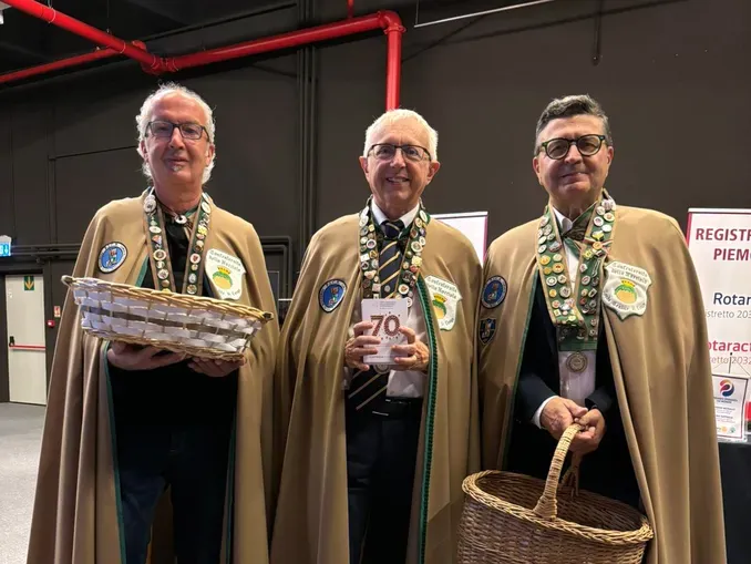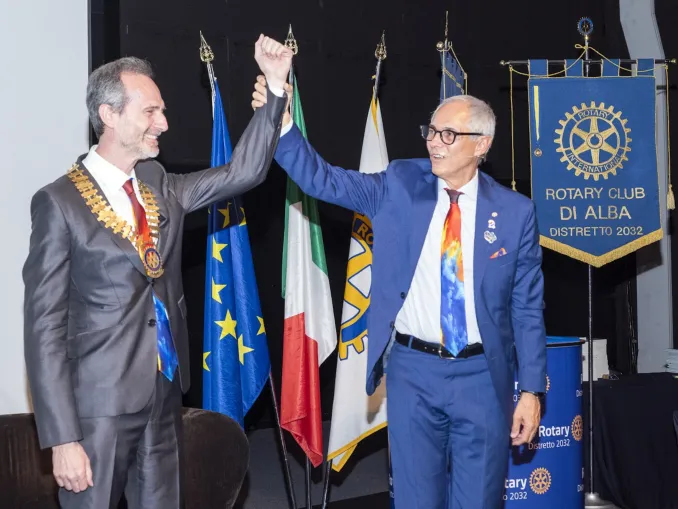 Il presidente Paolo Fortuna riceve il riconoscimento speciale per le attività a favore dei giovani per il club di Alba. Com’è tradizione del Rotary, la ruota gira e Remo Gattiglia consegna il collare, al nuovo governatore per l’anno rotariano 2024-25, Natale Spineto.