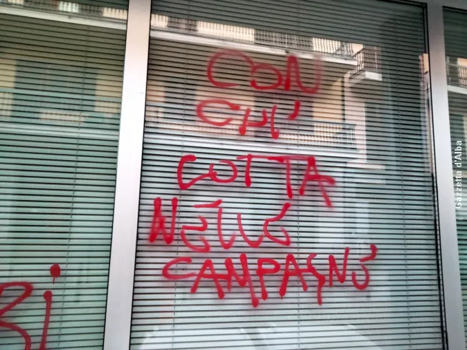 ALBA Non sono certo passate inosservate le scritte e i segni apparsi da sabato pomeriggio sulle vetrine esterne della sede di Coldiretti, ad Alba, in corso Matteotti, tra l’altro rinnovata di recente.