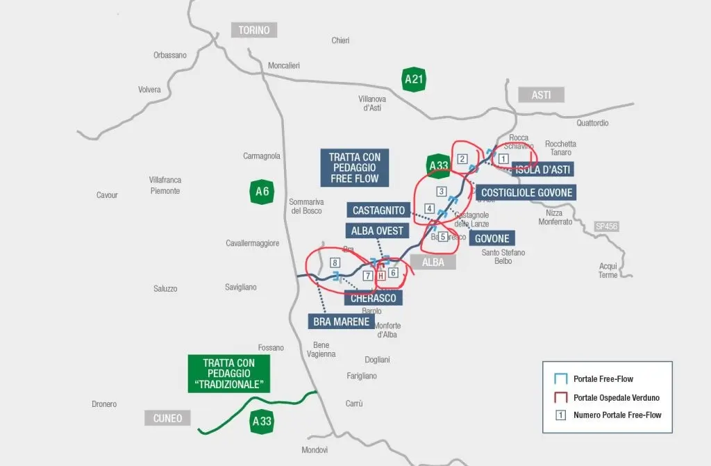 L’attivazione del sistema Free Flow sulla Asti-Cuneo è un processo graduale che coinvolge in questa prima fase i 4 portali compresi tra gli svincoli Asti (Rocca Schiavino) e Castagnito (Alba est). Sono previste agevolazioni, tra cui la gratuità delle percorrenze locali di Alba (tangenziale), di Asti (tratto Asti-Isola d’Asti) e del tratto Roddi-Alba ovest per chi, transitando sotto il portale 6, si recherà al polo ospedaliero passando sotto il portale H (posizionato lungo la viabilità di accesso all’ospedale) e viceversa.