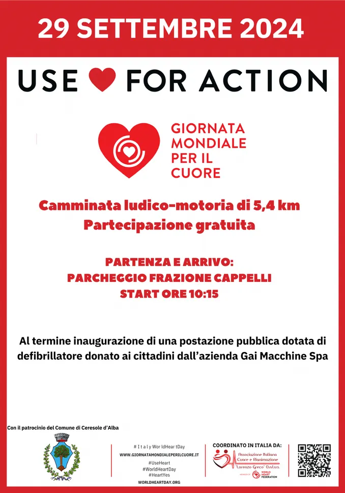 CERESOLE D’ALBA Domani, domenica 29 settembre, è la giornata mondiale per il cuore e Ceresole propone una camminata ludico motoria che partirà alle 10,15 dal parcheggio della frazione Cappelli, adiacente la provinciale 290, dove è stato installato un defibrillatore a disposizione della cittadinanza donato dall’azienda Gai Macchine Spa. L’escursione farà ritorno al punto di avvio dopo aver percorso 5,4 chilometri. La partecipazione è gratuita.