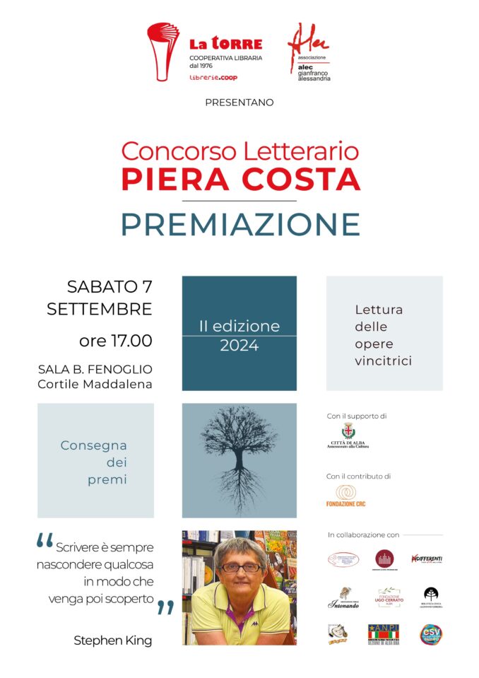 ALBA Sabato 7 settembre alle 17, in sala Beppe Fenoglio di Alba, si terrà la cerimonia di premiazione della seconda edizione del concorso letterario amatoriale “Scrittrici e scrittori per un giorno”. L’evento, organizzato dalla cooperativa libraria La torre e dall’associazione Alec, è un omaggio alla memoria di Piera Costa, una figura di spicco nella comunità, nonché socia fondatrice e per lungo tempo presidente della cooperativa.