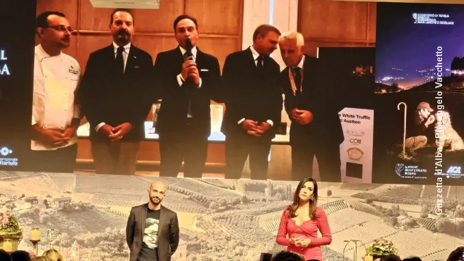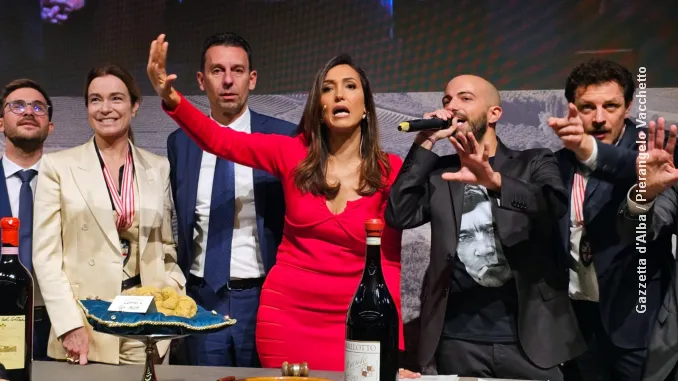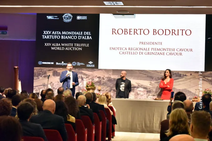 ORE 13.40: il primo lotto Battuto a 5mila euro il primo lotto, con Vittorio Brumotti e Fulvio Marino a scortare nella sala il primo lotto un tartufo da 201 grammi, con i magnum di Barolo e un panettone Albertengo da 10 kg.
