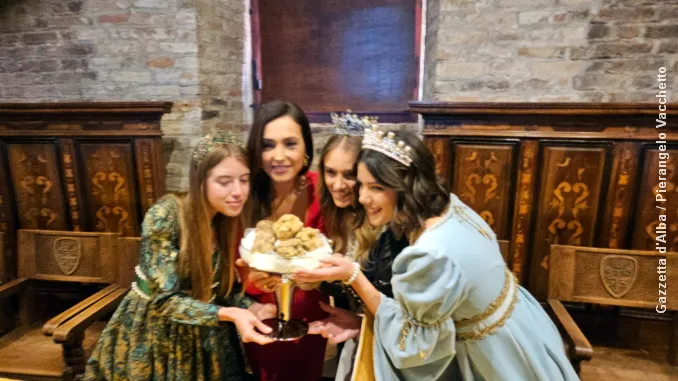 ORE 11: il castello si popola Sono gli sbandieratori e i musici della Città di Alba i primi a raggiungere il castello, per poi accogliere gli altri ospiti dell’Asta mondiale del tartufo 2024.