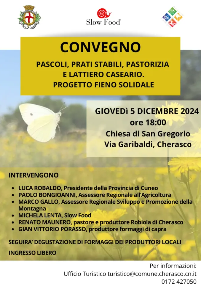 L’iniziativa Fieno solidale verrà illustrata giovedì 5 dicembre a Cherasco, nella Chiesa di San Gregorio, in via Garibaldi con convegno dal titolo: “Prati, pascoli stabili, pastorizia e lattiero caseario, progetto fieno solidale”. Parteciperà il presidente della Provincia e sindaco di Mondovì, Luca Robaldo, gli assessori regionali Paolo Bongiovanni (agricoltura) e Marco Gallo (montagna), Elena Lenta di Slow food e due produttori, Renato Maunero e Gian Vittorio Porasso.