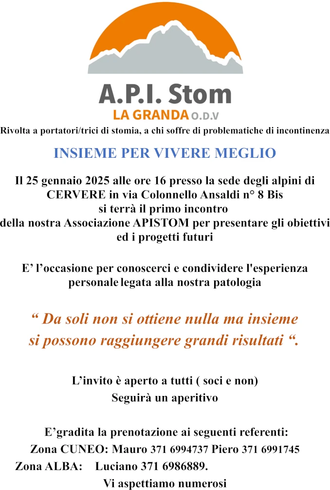 Merito del lavoro del vicepresidente Simona Marello e del gruppo dei sette fondatori, oggi i pazienti stomizzati del cuneese possono contare su un’associazione di riferimento. In un solo anno, Apistom la Granda è cresciuta rapidamente, estendendo la sua attività dall’albese a Cuneo, coinvolgendo territori come Savigliano, Mondovì e Fossano. Nuovi soci e volontari motivati stanno contribuendo al consolidamento dell’associazione.