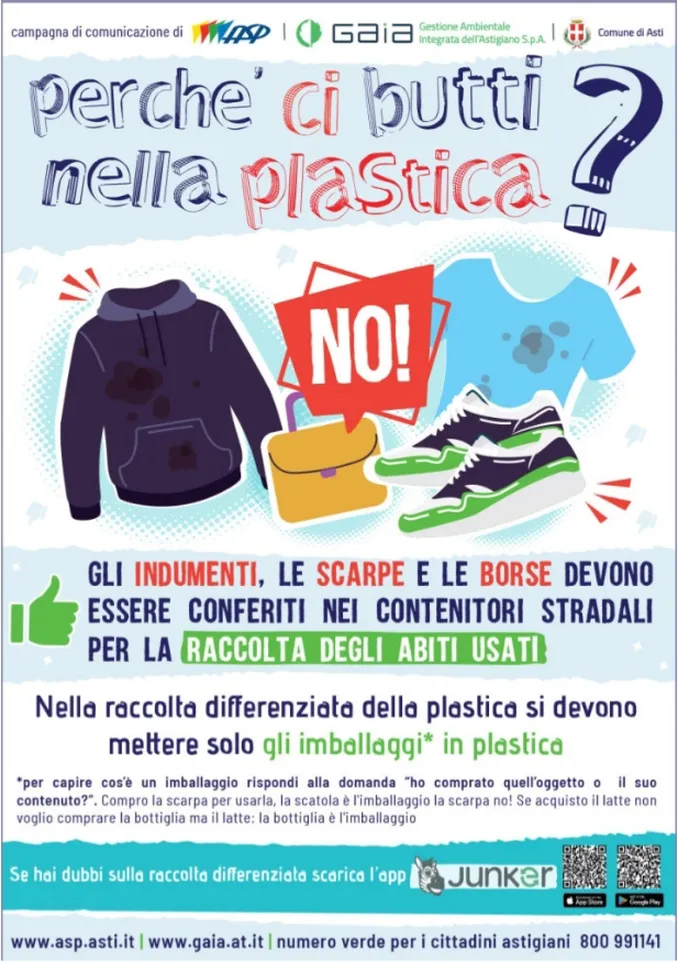 Un ulteriore aiuto è offerto dall’App gratuita Junker che, grazie a un database interno di oltre due milioni di oggetti, riconosce i prodotti dal loro codice a barre: inquadrandolo con la fotocamera dello smartphone o scattando una foto al prodotto, l’App indica in quale tipologia di rifiuti vanno conferiti. I dati registrati nel 2023, riferiti al Comune di Asti e forniti da Ispra per il Catasto rifiuti sezione nazionale, attestano una raccolta differenziata al 66,47%: valore positivo da migliorare, facendo attenzione soprattutto alle impurità che, nel caso della raccolta della plastica, non devono superare il 20% in peso (e ciò che non è imballaggio viene conteggiato come impurità).