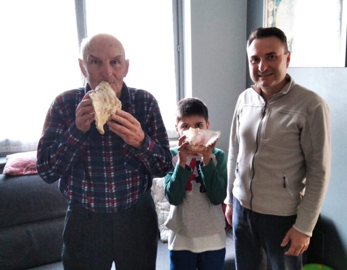 i tre tritoni suonano conchiglie roero Da sinistra: Renzo (classe 1943), Stefano (2015) e Roberto (1974) Ferrero.