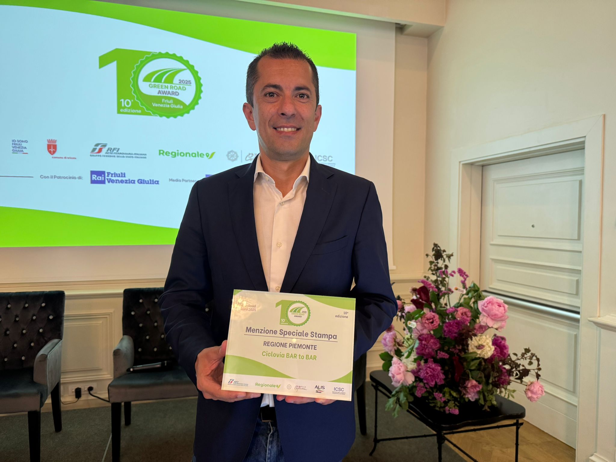 TRIESTE – In occasione del decennale del Green Road Award, il prestigioso riconoscimento che premia le migliori ciclovie d’Italia, la Regione Piemonte ha ricevuto una Menzione speciale della stampa per la ciclovia Bar to Bar, l’anello cicloturistico che collega due luoghi simbolo del nostro territorio: Barbaresco e Barolo, attraversando i paesaggi mozzafiato delle colline Unesco.