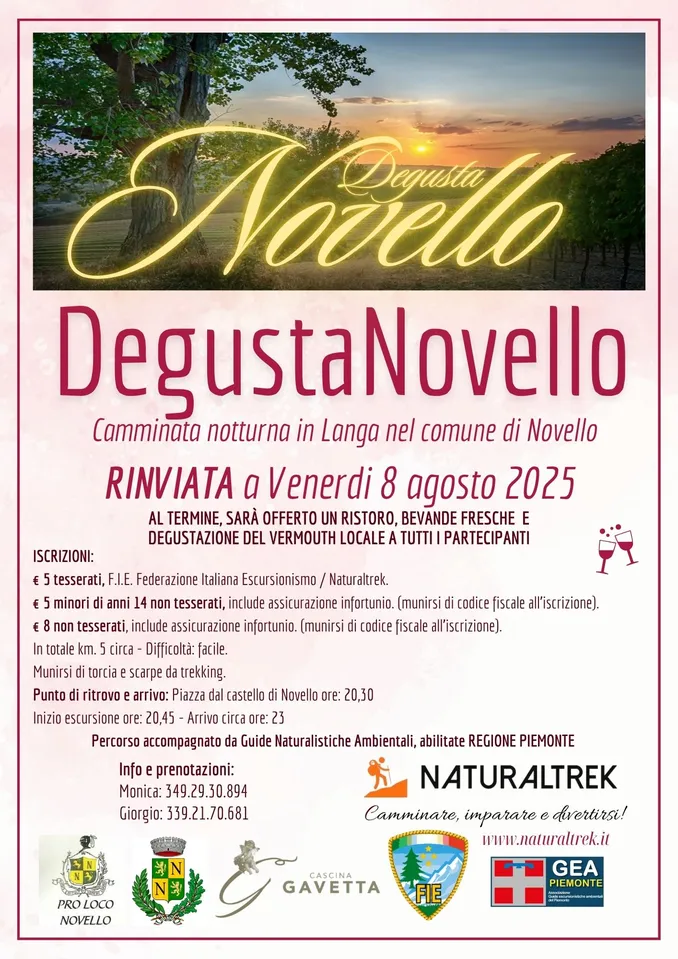 NOVELLO – Degusta Novello, in programma è stato rinviato a venerdì 8 agosto, partendo alle 20.30 dal castello, a causa di un temporale poco prima della partenza che ha reso impraticabile il percorso in alcuni punti.