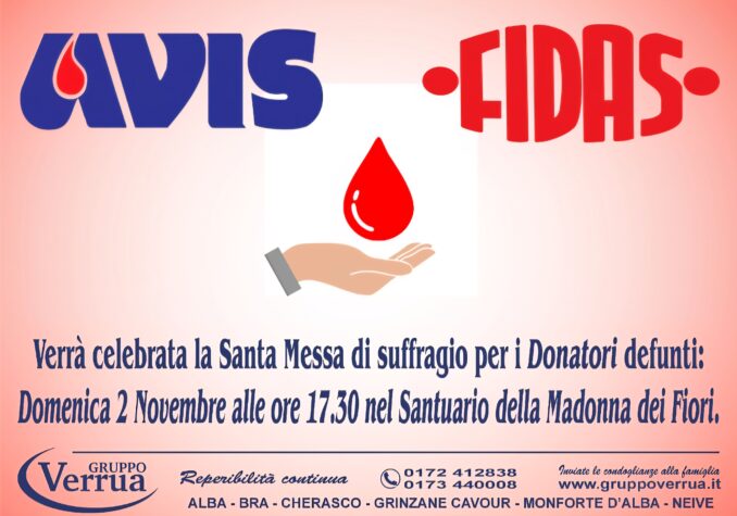 BRA – Come ormai da tradizione ogni anno, le sezioni braidesi dell’Avis e della Fidas ricorderanno le donatrici e i donatori defunti con una messa di suffragio domenica 2 novembre, alle 17.30, presso il santuario della Madonna dei fiori. Un ricordo prezioso e doveroso per coloro che non sono più con noi ma hanno voluto.