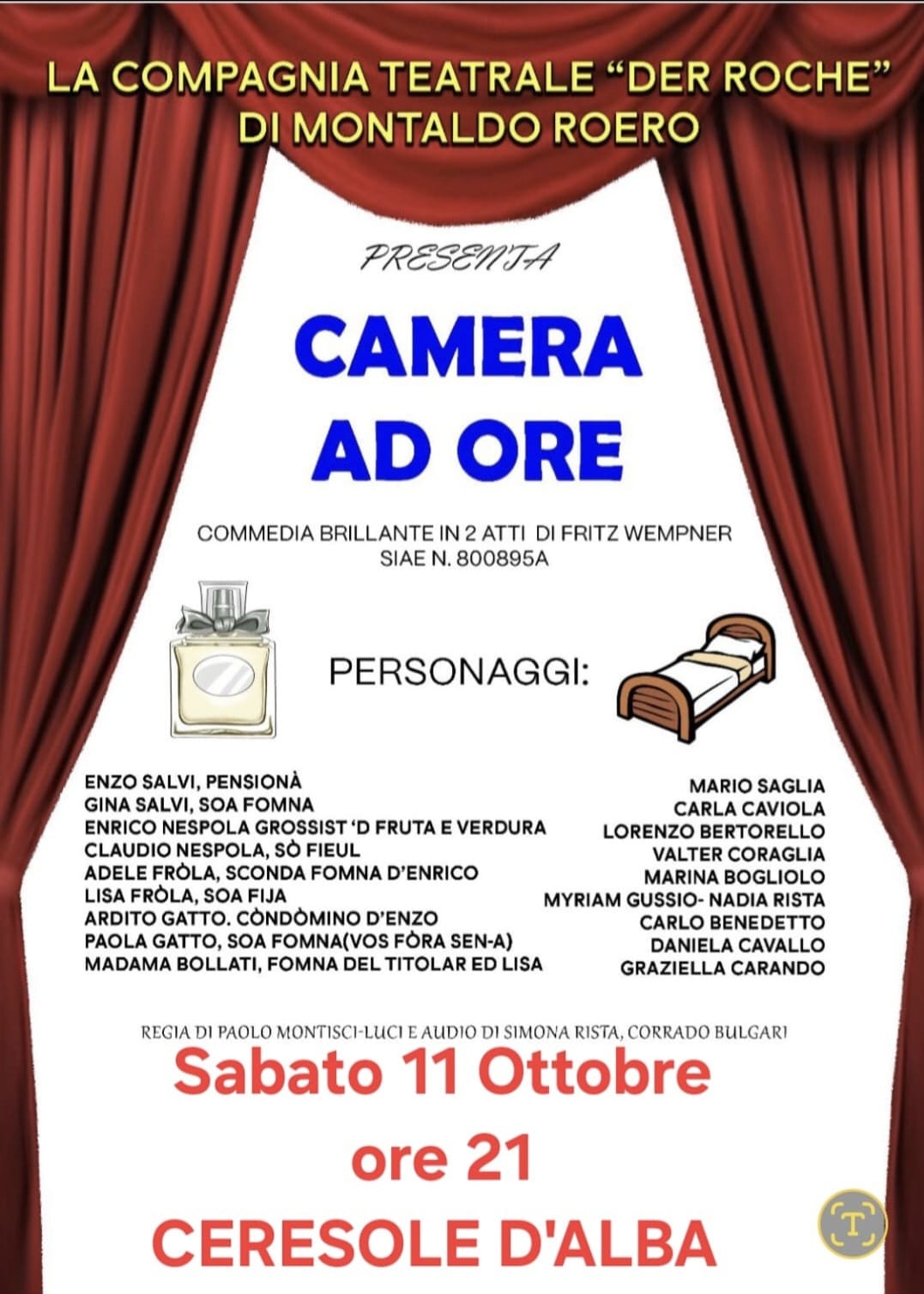 CERESOLE – Andrà in scena sabato 11 ottobre, alle 21 sul palco del cinema parrocchiale di Ceresole (in piazza Vittorio Emanuele), lo spettacolo Camera a ore, della compagnia teatrale Der Roche, che proprio quest’anno festeggia i trent’anni dalla fondazione, con ben 24 commedie all’attivo, un musical e più 300 repliche.